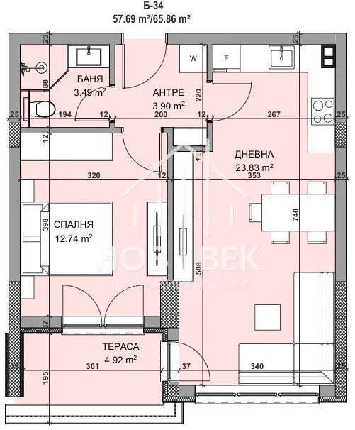 Имотът е с чиста жилищна площ от 57,69 кв.м и се състои от: дневна с кухня и трапезария, спалня , балкон и баня с тоалетна.