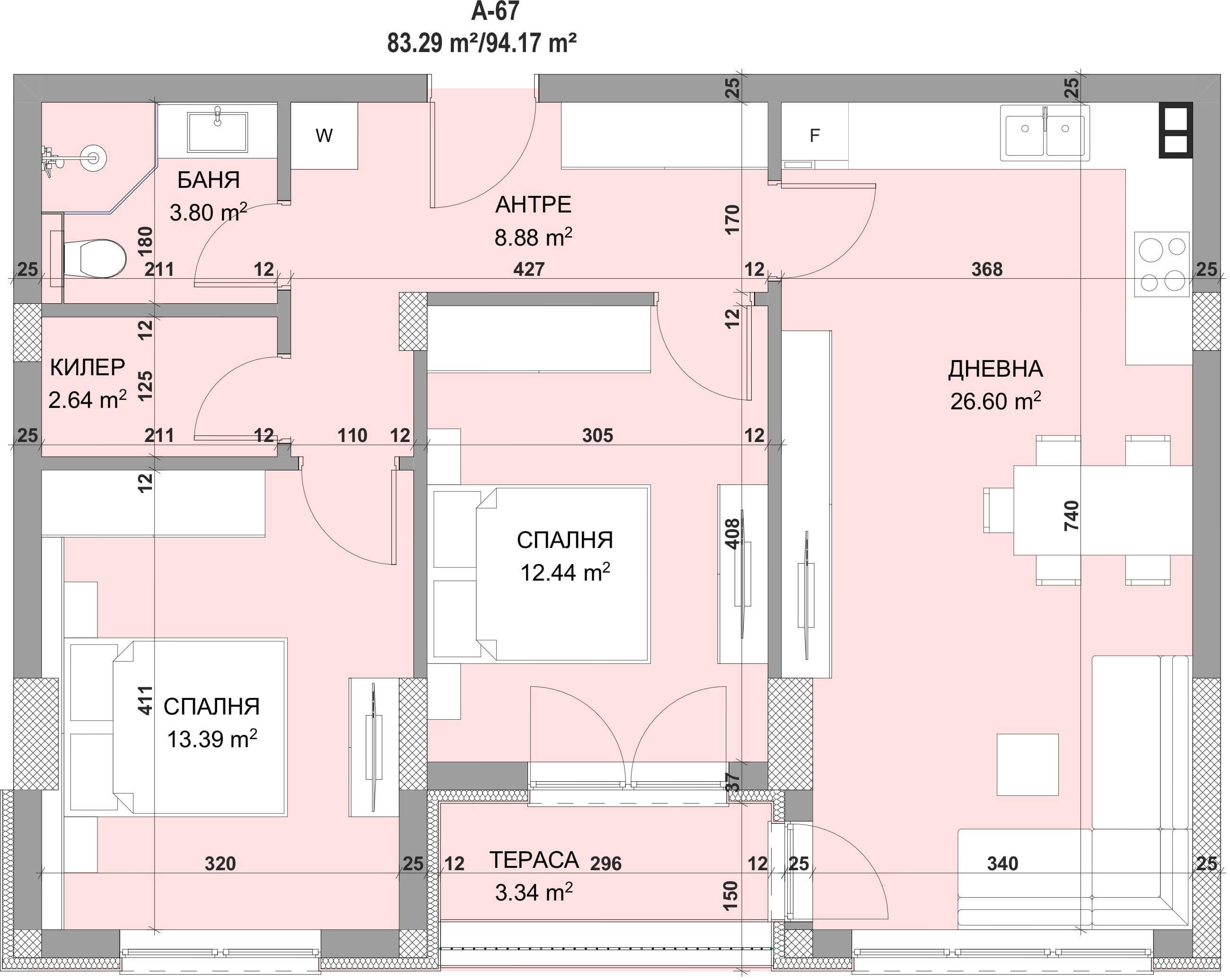 Апартамент – дневна с кухненски бокс, 2 спални, баня с тоалетна, килер, антре, тераса