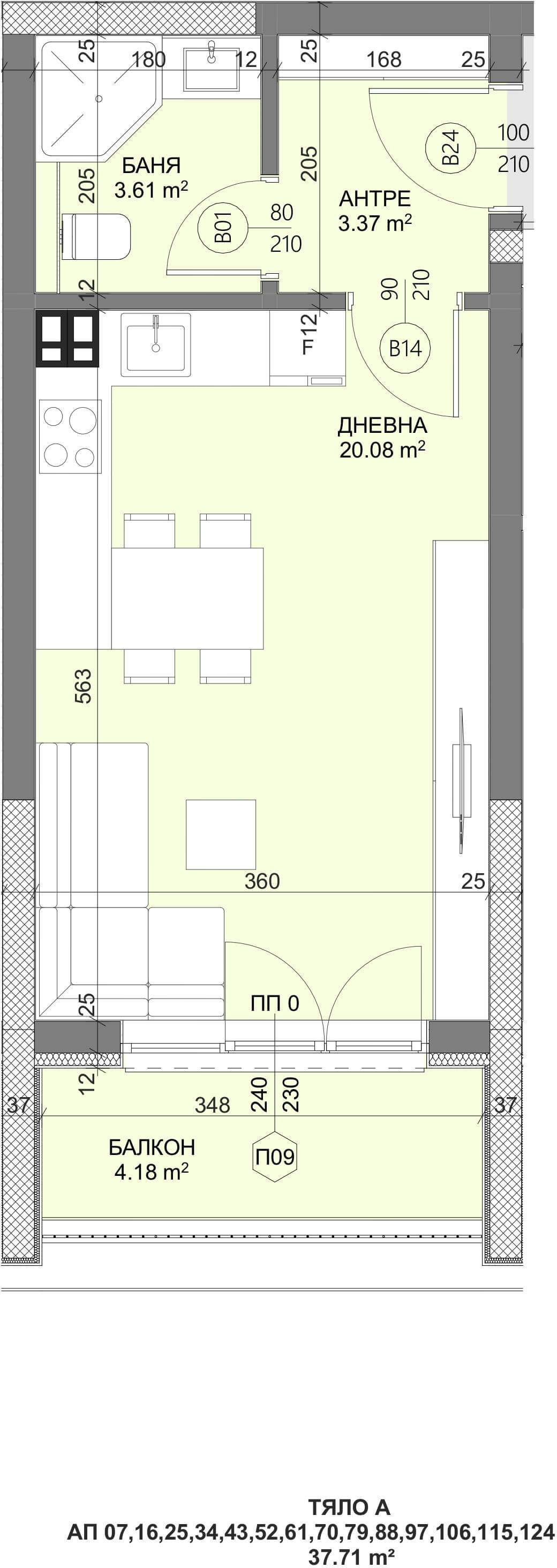 Апартамент – Дневна с кухненски бокс, баня с тоалетна, антре и балкон.