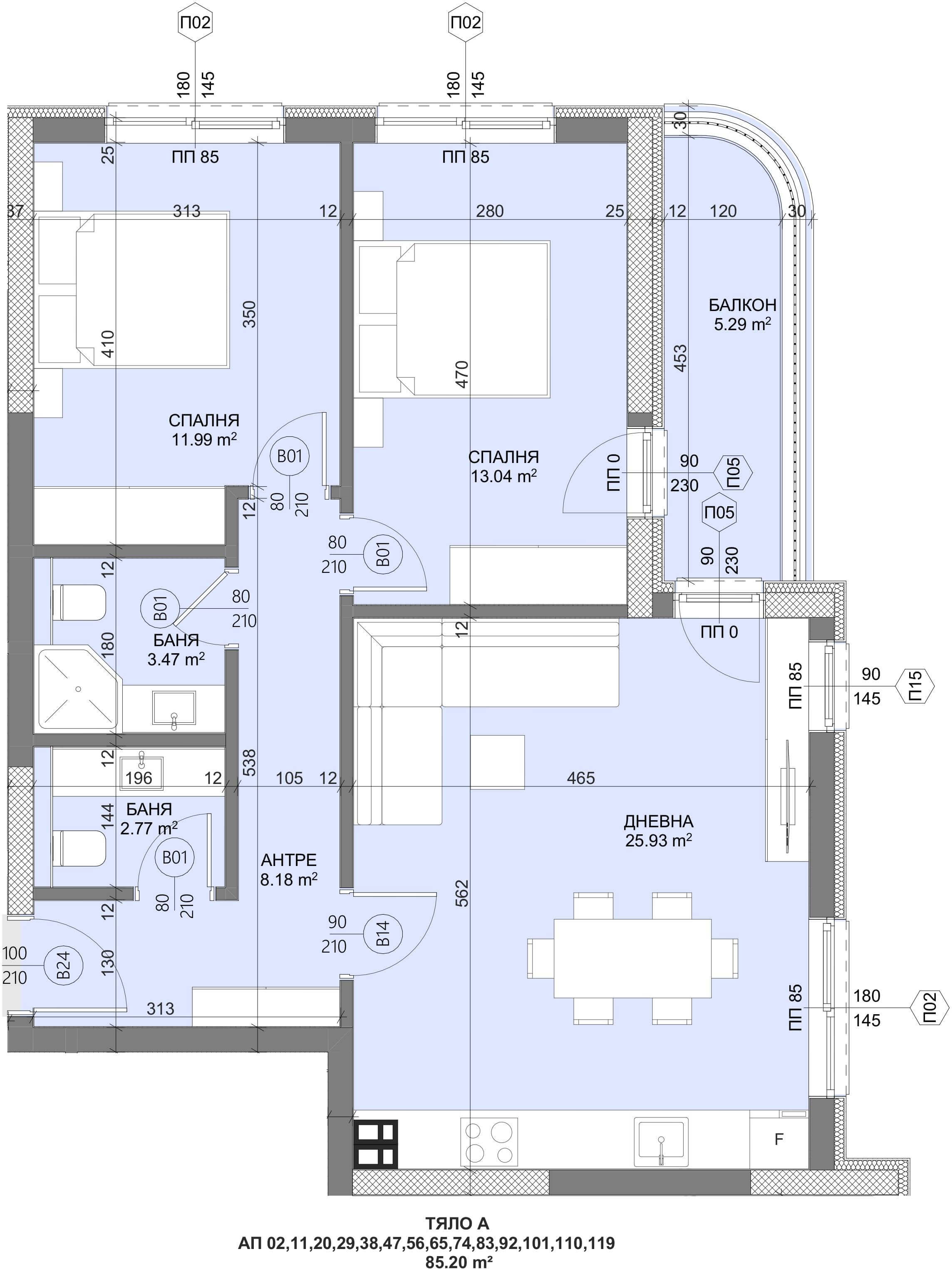 Апартамент – Дневна с кухненски бокс, 2 спални, баня с тоалетна, тоалетна, антре и балкон.