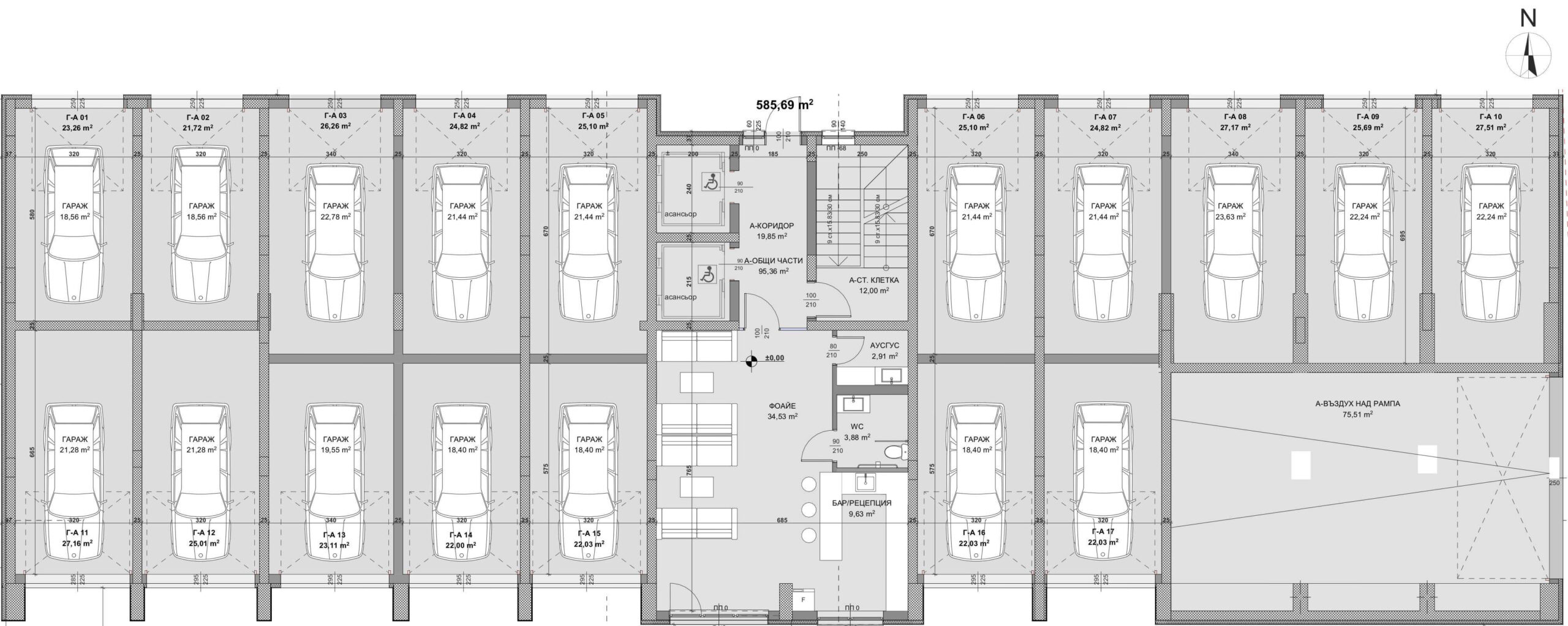 Гараж с обща площ 24,45кв.м., което включва 22,03 кв.м чиста площ и 2,42 кв. м общи части.