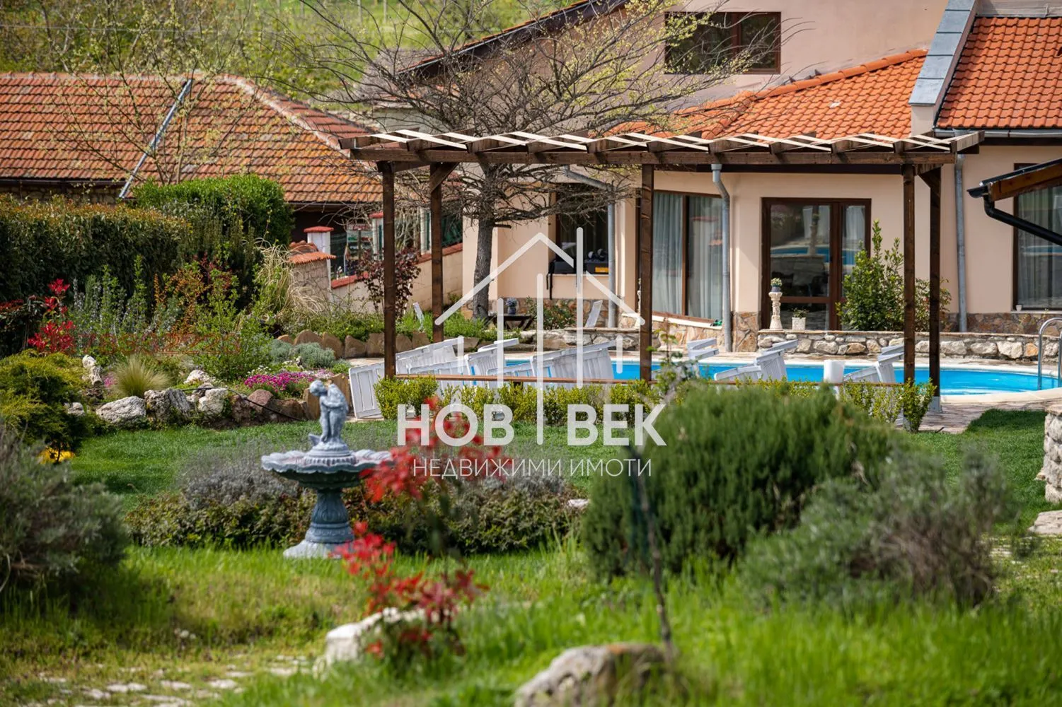 - Басейн (отопляем) с експлоатация май–септември; стилно обзаведен двор с много кътове за почивка.