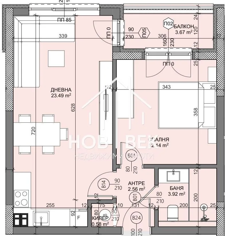 Имотът е с чиста жилищна площ от 55,87 кв.м и се състои от: коридор, дневна с кухня и трапезария, една спални, един балкон, баня с тоалетна, килер/перално. Към всеки имот ще бъдат включени съответните идеални части от общите части на сградата, както и от земята върху която ще бъде изграден обекта.