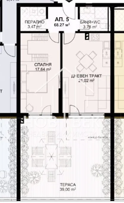 Разпределението е както следва : коридор, баня с тоалетна, перално, хол с кухня и трапезария, спалня, тераса. Към апартамента има предвидено за закупуване паркомясто с топла връзка.