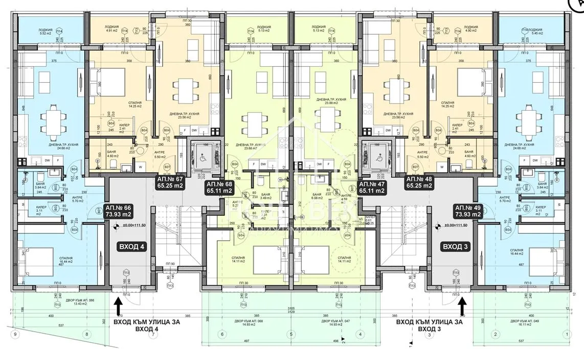 - приземни апартаменти със самостоятелни дворове, с различни квадратури и разпределения;
