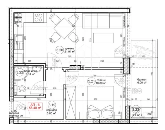 - Разпределение: входно антре, дневна с кухненски бокс, спалня, баня с тоалет, тераса