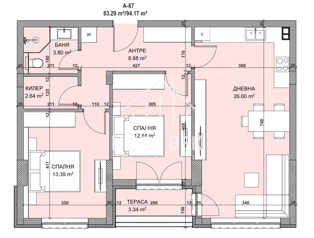 Имотът е с обща жилищна площ от 94,17 кв.м. и се състои от: коридор, дневна с кухня и трапезария, две спални, балкон пред една от спалните с достъп и от дневната , баня с тоалетна, килер/перално . Към всеки имот ще бъдат включени съответните идеални части от общите части на сградата, както и от земята върху която ще бъде изграден обекта.