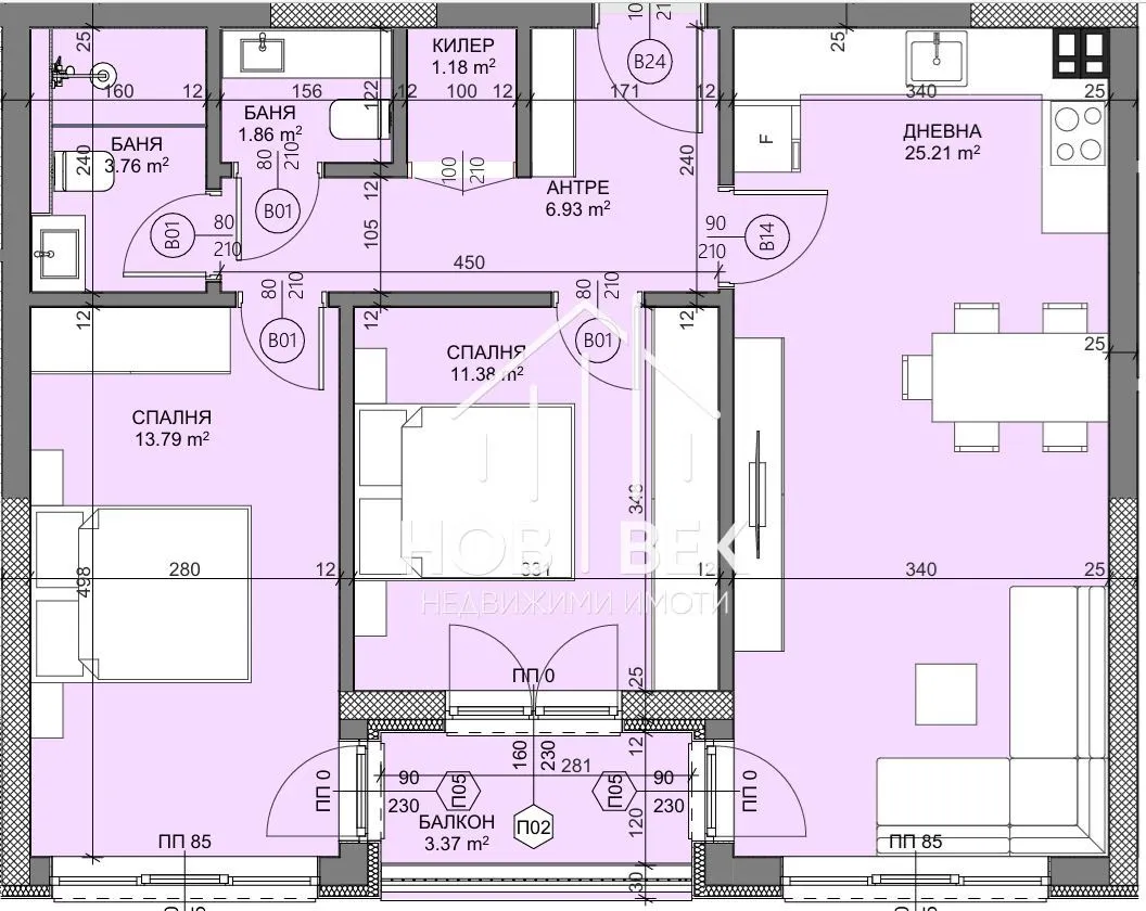 Имотът е с чиста жилищна площ от 79.87кв.м. и се състои от: коридор, дневна с кухня и трапезария, две спални, един балкон, баня с тоалетна, килер/перално, втора тоалетна . Към всеки имот ще бъдат включени съответните идеални части от общите части на сградата, както и от земята върху която ще бъде изграден обекта.