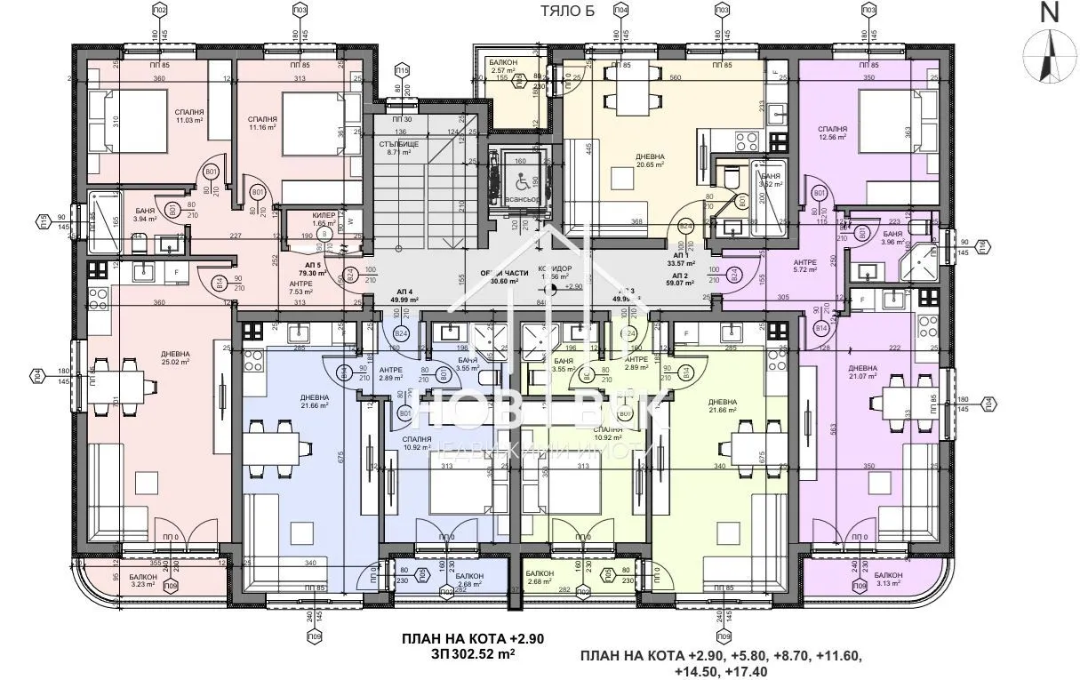 Светли и просторни стаи с правилни форми, всяко жилище разполага с 1 или 2 сервизни помещения;