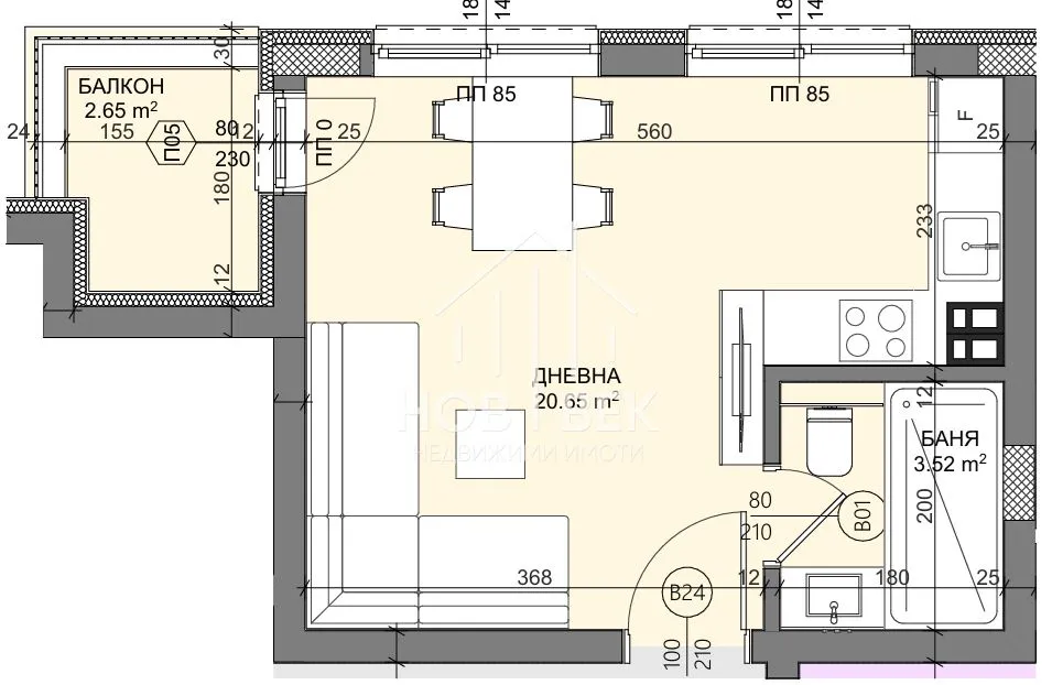 Имотът е с чиста жилищна площ от 33.57 кв.м. и се състои от: дневна с кухня и трапезария, един балкон , баня с тоалетна. Към всеки имот ще бъдат включени съответните идеални части от общите части на сградата, както и от земята върху която ще бъде изграден обекта.
