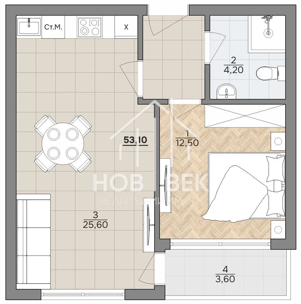 Апартаментът се състои от дневна с кухненски бокс и трапезария, спалня, баня, коридор, балкон с панорамна гледка към морето.