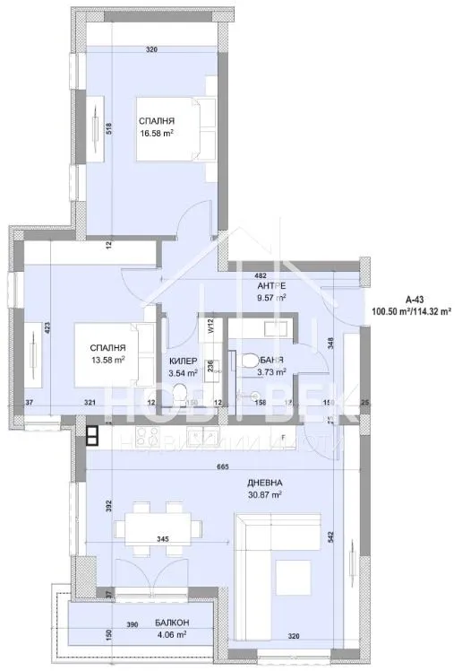 Имотът е с обща жилищна площ от 114,32 кв.м. и се състои от: коридор, дневна с кухня и трапезария, две спални, балкон пред дневната, баня с тоалетна, килер/перално, втора тоалетна . Към всеки имот ще бъдат включени съответните идеални части от общите части на сградата, както и от земята върху която ще бъде изграден обекта.