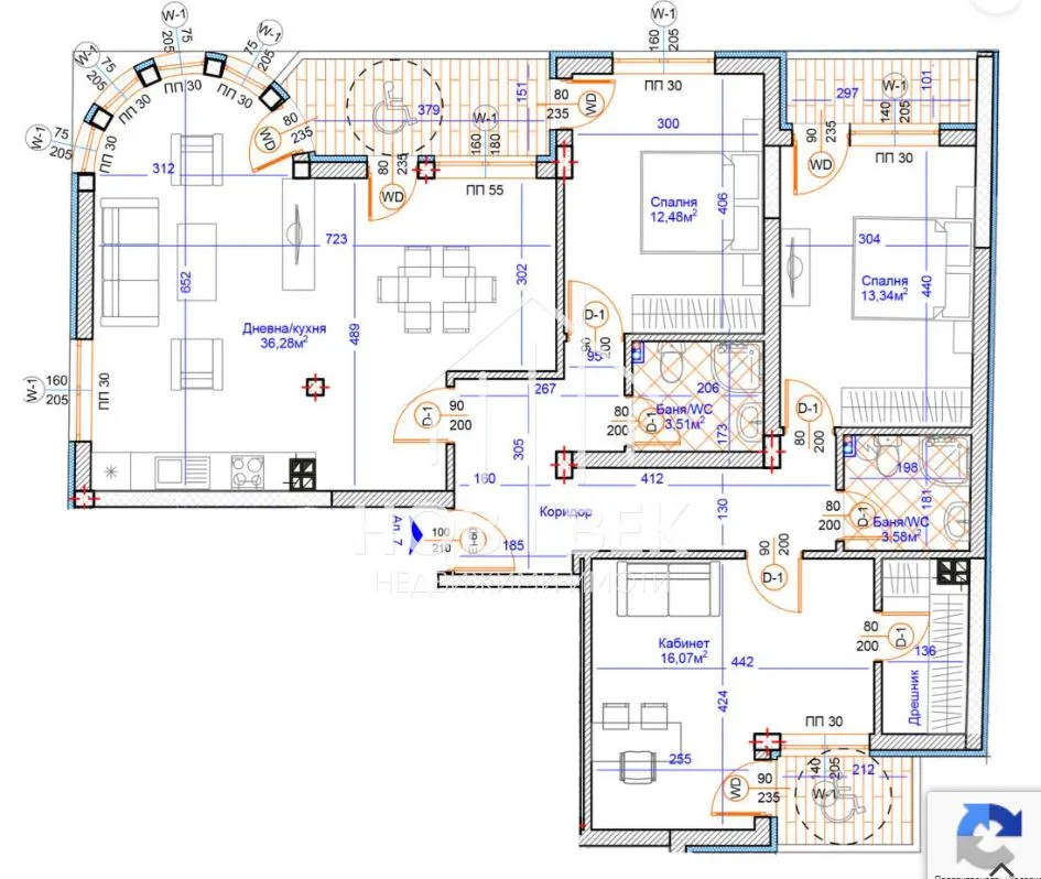 Възползвайте се от огромната дневна (36.28 кв.м), която предлага усещане за открито пространство и е идеално място за забавления и почивка. Три изискани спални (12.48 кв.м, 13.34 кв.м и 16.07 кв.м) ви предоставят не само уют, но и възможността да трансформирате третата стая в кабинет или просторен дрешник.