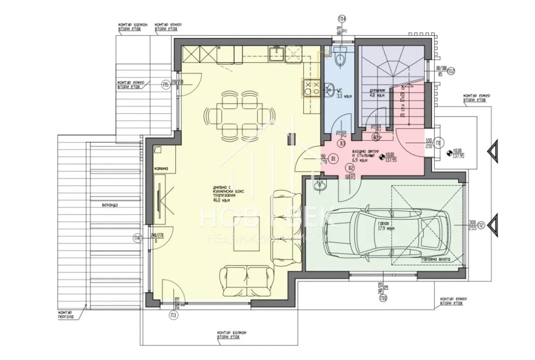 Първи етаж е със ЗП 95,4 кв.м. и се състои от: